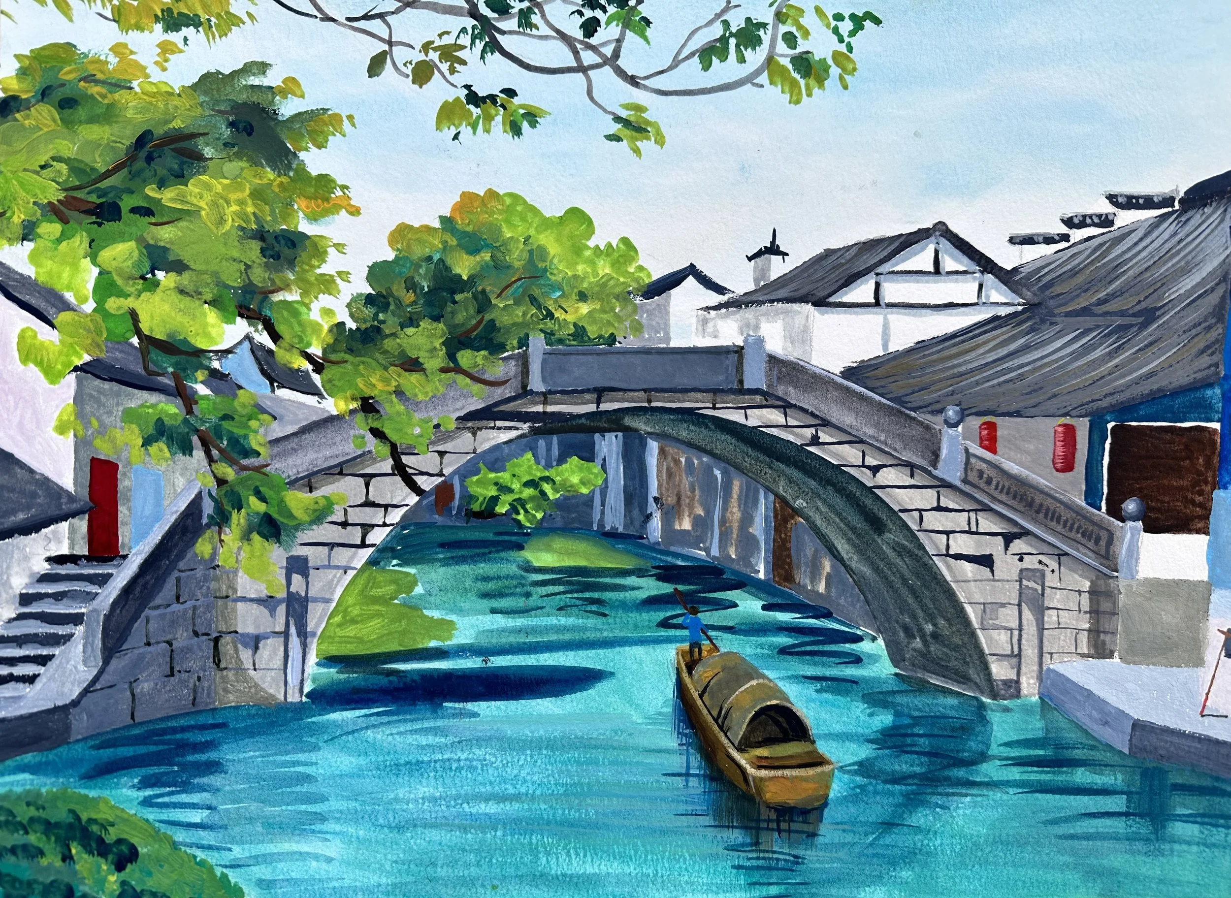 "Southern Shore" depicts a tranquil waterside scene in Hangzhou, China, where a lone boat glides peacefully through the landscape. It highlights the natural beauty of the shore and the charm of the ancient architecture along its edge.