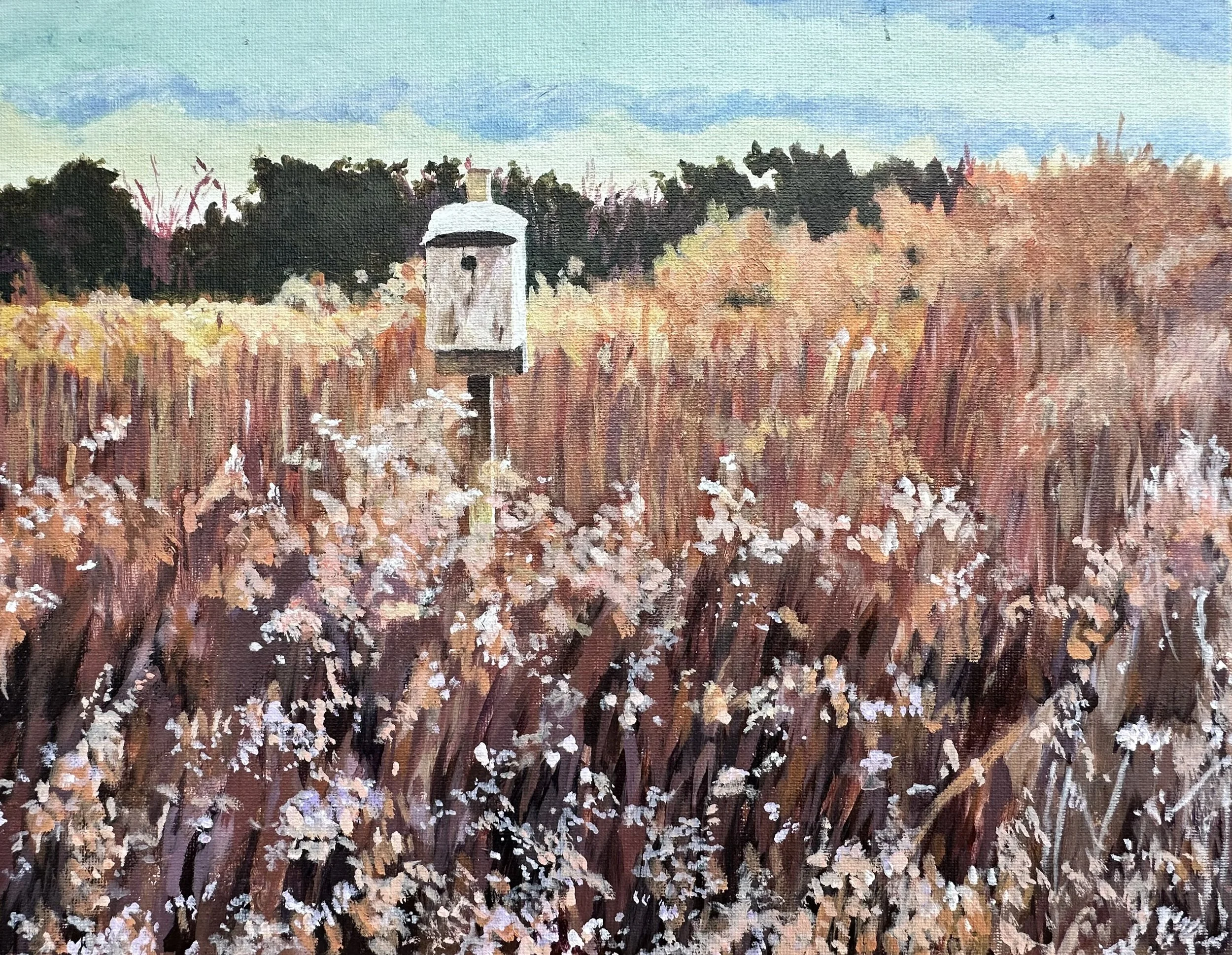 "Bird House" was painted on the site of Hobler Park, New Jersey. It highlights the quiet harmony between a human-made birdhouse and the natural environment, focusing on the birdhouse as a gentle meeting point between the two.