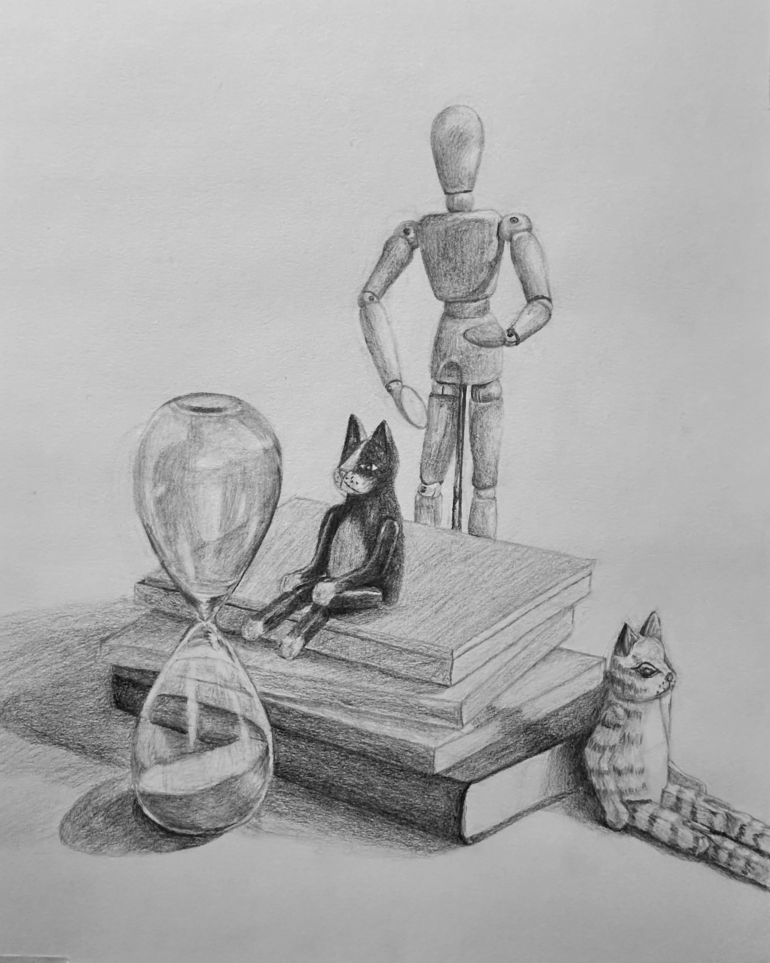 “Quiet Companions” shows two small cat dolls resting on a stack of books beside an hourglass and a wooden mannequin. The setup feels like time has slowed down, and these little objects are quietly keeping each other company.