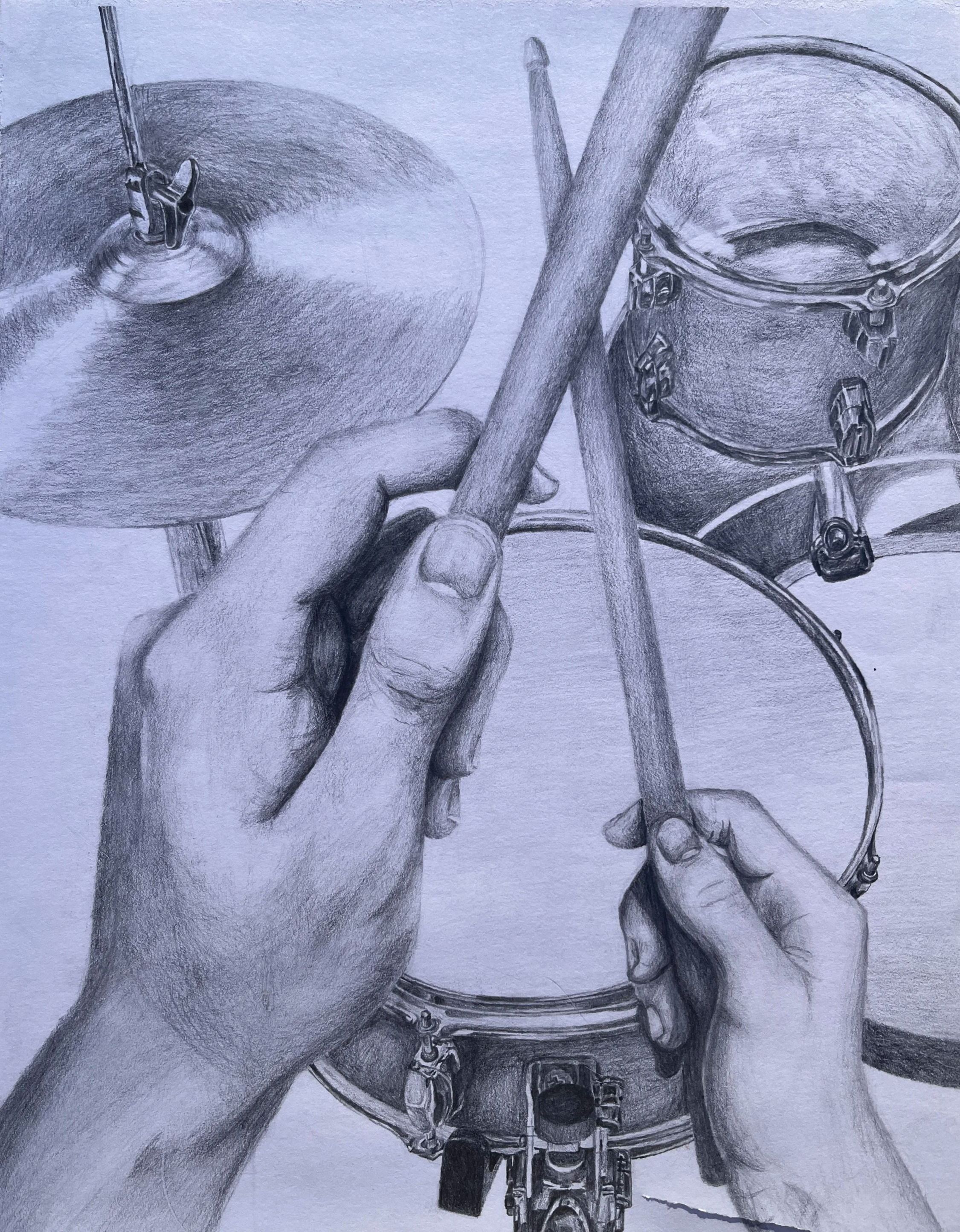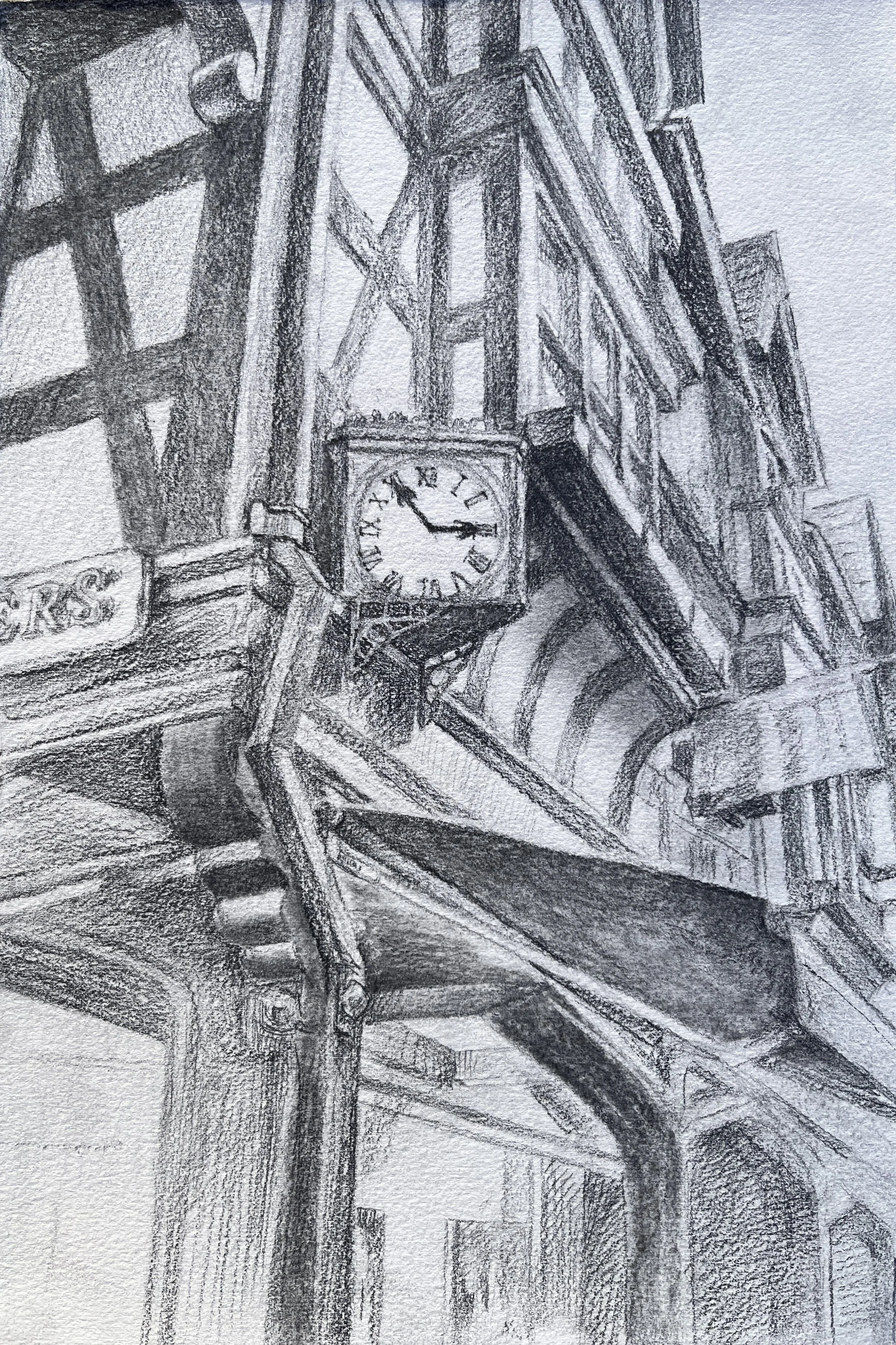 "Clock above Hamilton Jelwery" depicts a corner of Princeton’s Nassau Street, centered on a projecting clock above the building of Hamilton Jeweries. The graphite and pencil drawing emphasizes the structure’s Tudor-style timber framing and historic architectural character.