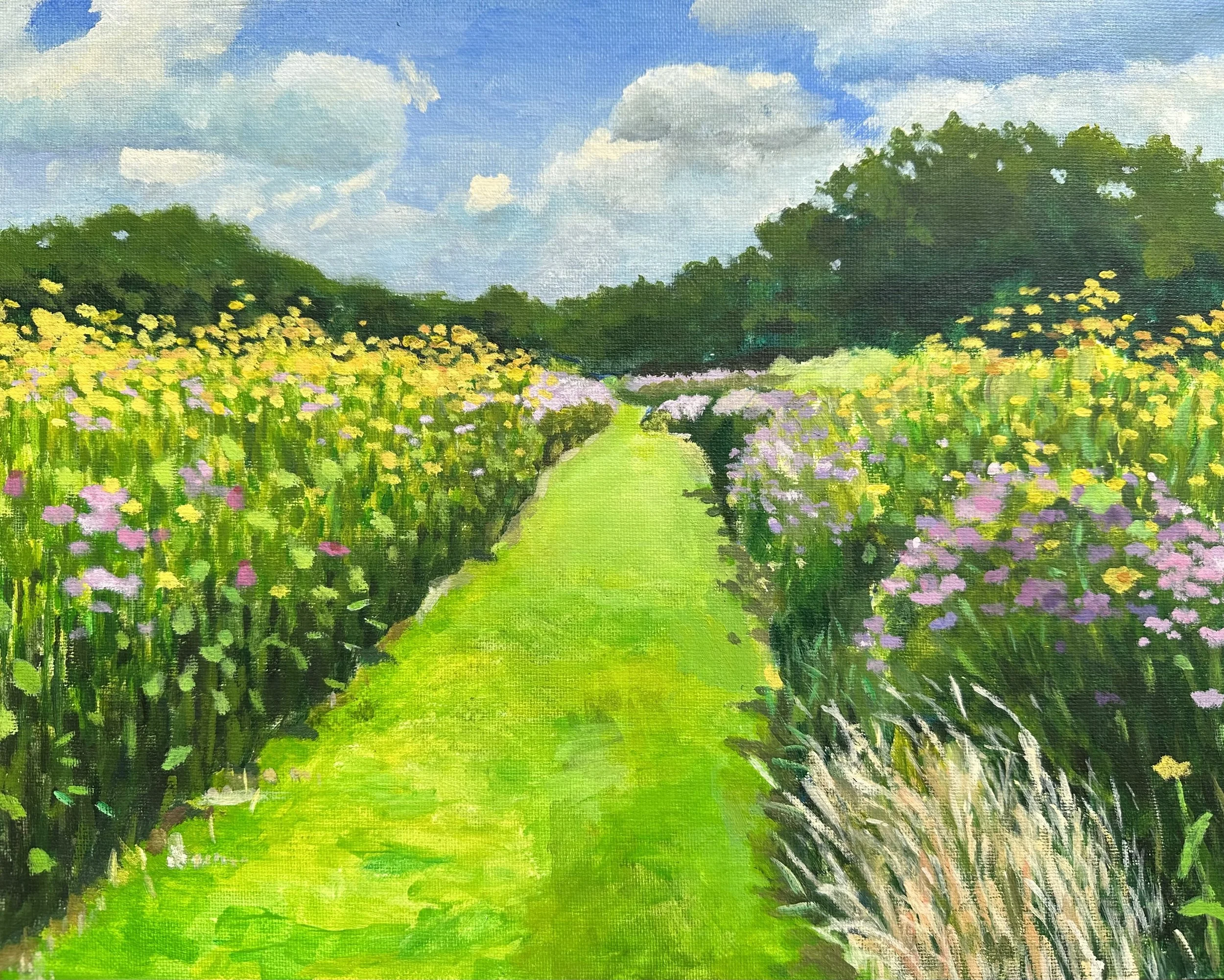 "Path to Summer" depicts a sunlit trail lined with tall flowers at the D&R Greenway Land Trust in Princeton, New Jersey. Warm tones and layered blooms create a peaceful, cheerful atmosphere that invites viewers into a calm summer walk.